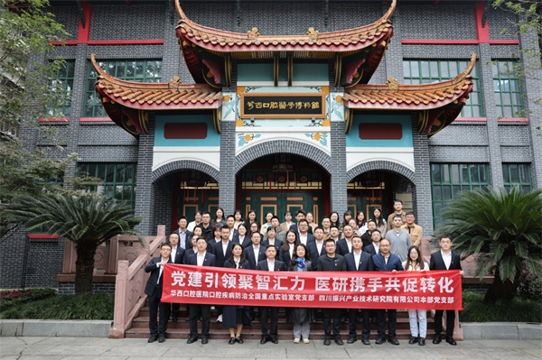 活动中,五个党支部成员先后参观了华西口腔医院博物馆与口腔疾病防治全国重点实验室。座谈交流环节,双方围绕医疗成果转化实践经验与进展,支部党建特色、核心业务及发展规划,产业技术研究方向与成果等开展交流分享。
