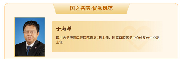 于海洋教授是中华口腔医学会口腔修复学专委会主任委员、中国口腔医学技术联盟理事长、口腔修复国家临床重点专科负责人,荣获“大美医者”、四川省有突出贡献的优秀专家等称号。1997年从业至今,累计完成口腔疑难病与罕见病的数字化修复重建等7000余例,首创数字化引导显微精准修复术,实现口腔修复治疗个体化、精准化,打造精准修复“中国方案”。