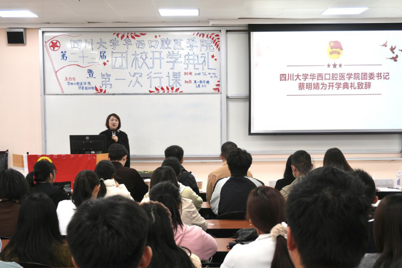 2025年11月16日,我院第二十三届团校开学典礼暨第一次行课在江安校区隆重举行。四川大学青年讲师团成员向琳、阙林、孙一民、饶思晗,学院团委书记蔡明婧、辅导员林丽丽以及2025级全体本科生团员和入团积极分子共同参加。