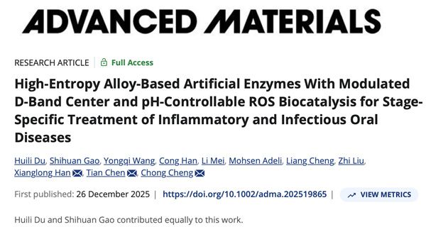 近日,我院陈甜助理研究员/韩向龙教授团队,联合四川大学高分子工程学院程冲研究员团队在pH响应性人工纳米酶用于炎症性和感染性口腔疾病的治疗方面取得重要进展,研究成果以“High-Entropy Alloy-based Artificial Enzymes with Modulated d-Band Centre and pH-Controllable ROS Biocatalysis for Stage-Specific Treatment of Inflammatory and Infectious Oral Diseases ”为题发表在 Advanced Materials杂志。程冲研究员、陈甜助理研究员、韩向龙教授为本文通讯作者,杜慧丽和高世桓为共同第一作者。