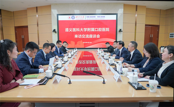 4月16日,贵州省政协教科卫体委员会副主任、我院1999届校友刘建国,遵义医科大学附属口腔医院党委书记、院长李航,党委副书记白国辉,副院长吴家媛等一行来我院交流访问。我院党委书记谭静,副院长杨征、朱桂全及相关职能部门负责人参加座谈。